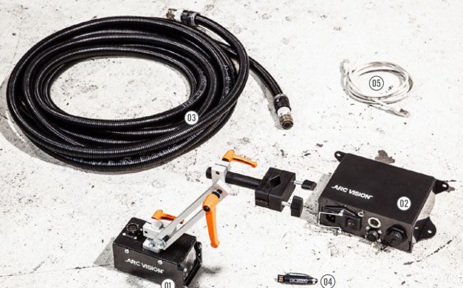 Caméra automatisée, avec éclairage LED Réglages mémorisés pour observation de l’arc du joint de soudage, du cordon de soudure Ensemble composé : 1 Caméra sur support articulé 1 Câble de 10 m 1 Boitier d’alimentation 1 Logiciel sur clé USB Existe en version refroidie par eau